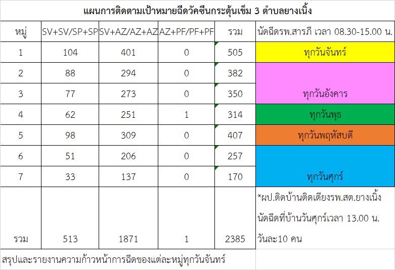 จำนวนผู้ที่ยังไม่ได้รับวัคซีนโควิด 19 เข็มสาม และสามารถเข้ารับได้ที่ รพ.สารภี ตามวันและเวลาจองแต่ละหมู่บ้านในตาราง