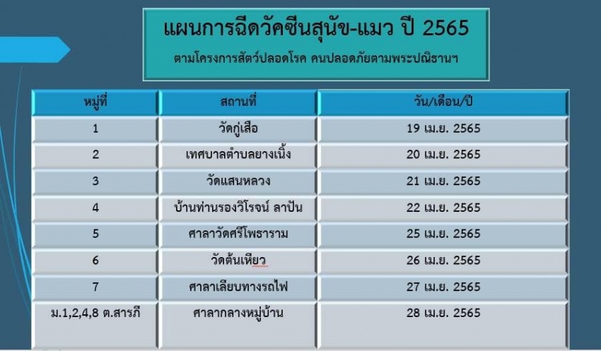 ตารางฉีดวัคซีนป้องกันโรคพิษสุนัขบ้า ประจำปี 2565 เวลา 09.00 - 11.30 น.