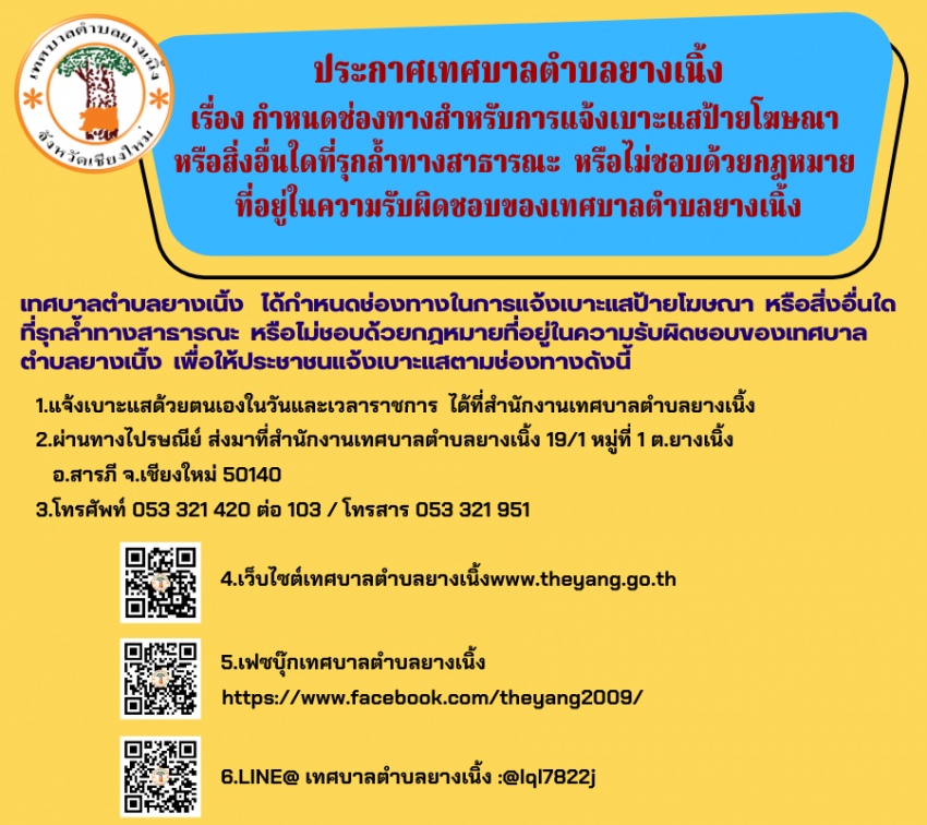 เรื่อง กำหนดช่องทางสำหรับการแจ้งเบาะแสป้ายโฆษณา หรือสิ่งอื่นใดที่รุกล้ำทางสาธารณะ หรือไม่ชอบด้วยกฎหมาย ที่อยู่ในความรับผิดชอบของเทศบาลตำบลยางเนิ้ง