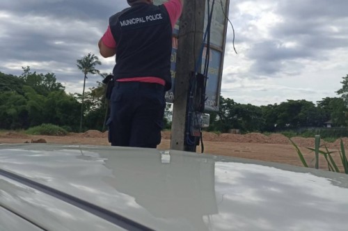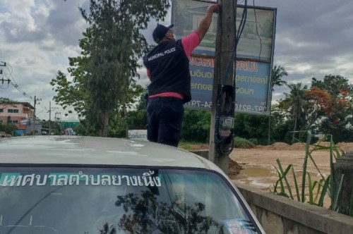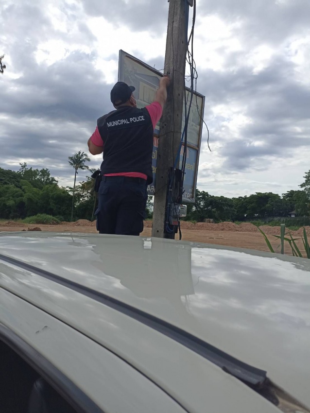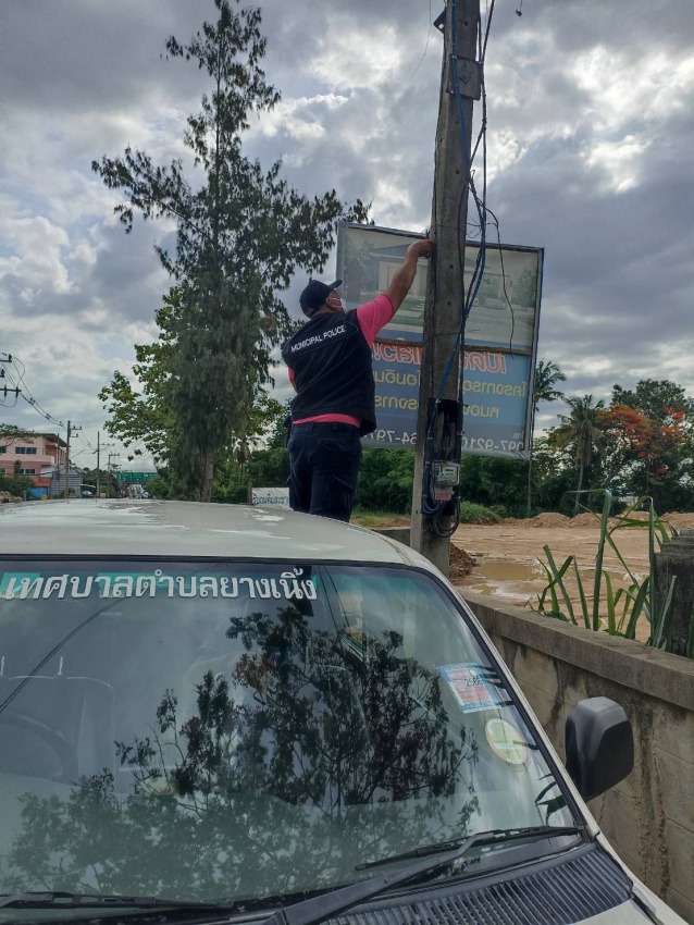 17 พฤษภาคม 2565 งานเทศกิจ เทศบาลตำบลยางเนิ้ง ออกกวดขันการติดตั้งป้ายโฆษณาตามประกาศเทศบาลตำบลยางเนิ้ง บริเวณหมู่ที่ 3