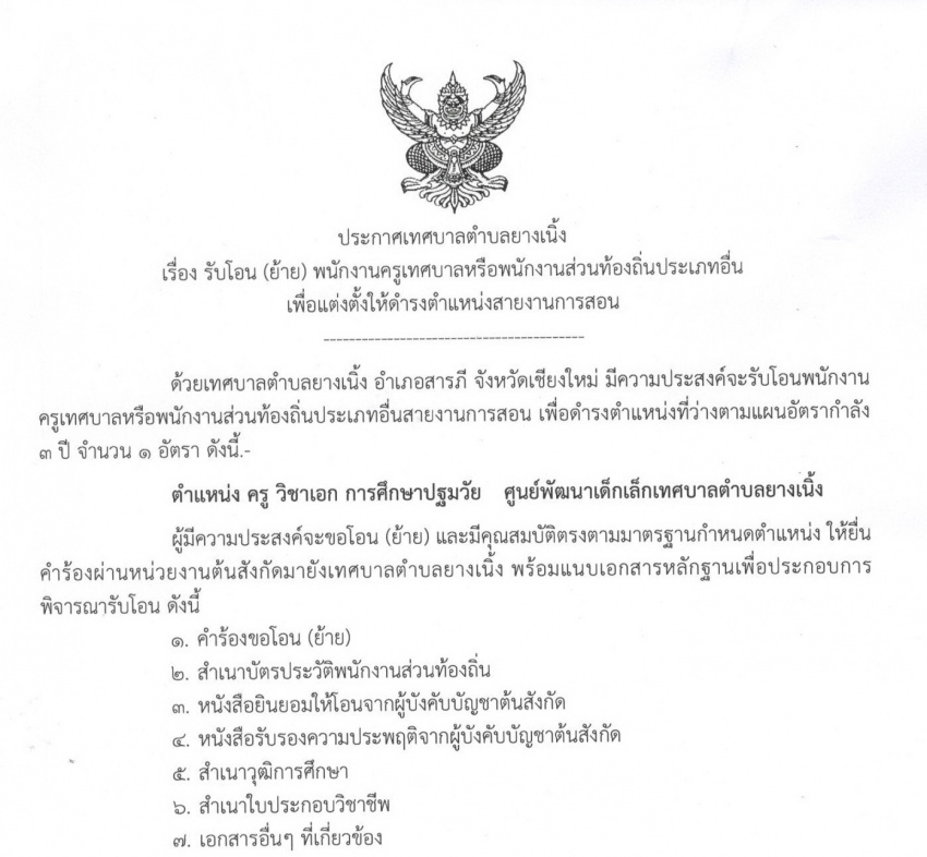 ประกาศรับโอน ครู ศูนย์พัฒนาเด็กเล็กเทศบาลตำบลยางเนิ้ง