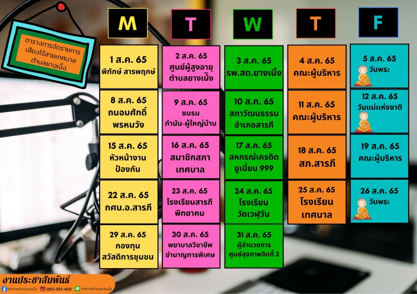 ตารางเสียงไร้สายเทศบาลตำบลยางเนิ้งประจำเดือน สิงหาคม 2565