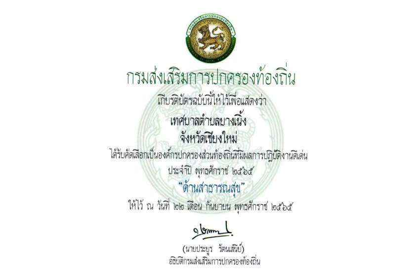 เทศบาลตำบลยางเนิ้ง ได้รับการคัดเลือกเป็นองค์กรปกครองส่วนท้องถิ่น
