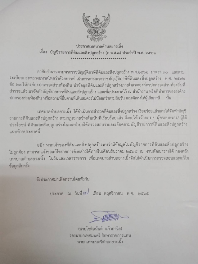 ประกาศเทศบาลตำบลยางเนิ้ง เรื่อง บัญชีรายการที่ดินและสิ่งปลูกสร้าง (ภ.ด.ส.3) ประจำปี 2566