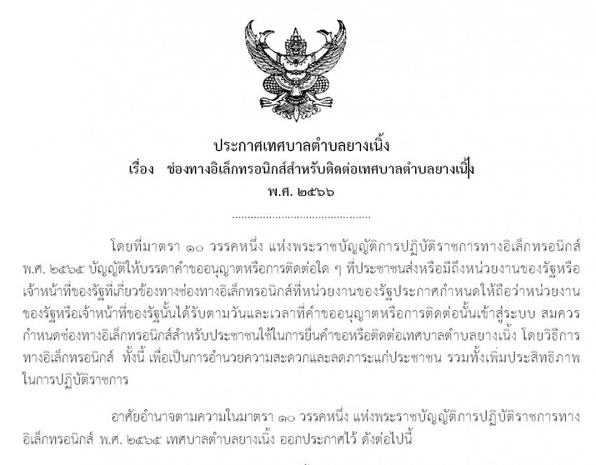 ประกาศเทศบาลตำบลยางเนิ้ง เรื่อง ช่องทางอิเล็กทรอนิกส์สำหรับติดต่อเทศบาลตำบลยางเนิ้ง พ.ศ. ๒๕๖๖