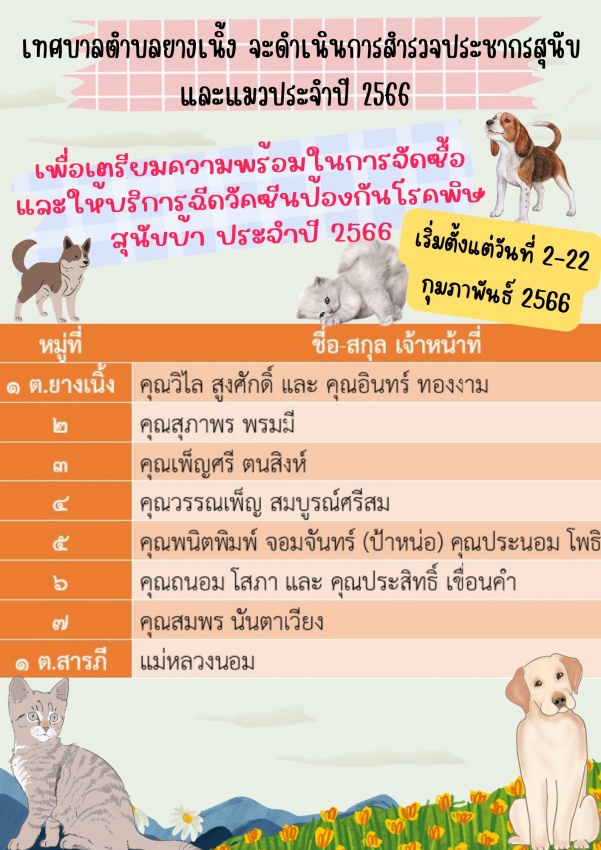 ประชาสัมพันธ์ การสำรวจสุนัขและแมว เพื่อเตรียมความพร้อมในการจัดซื้อและให้บริการฉีดวัคซีนป้องกันโรคพิษสุนัขบ้า ประจำปี 2566