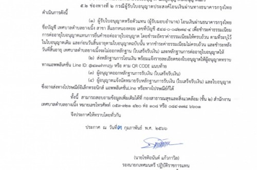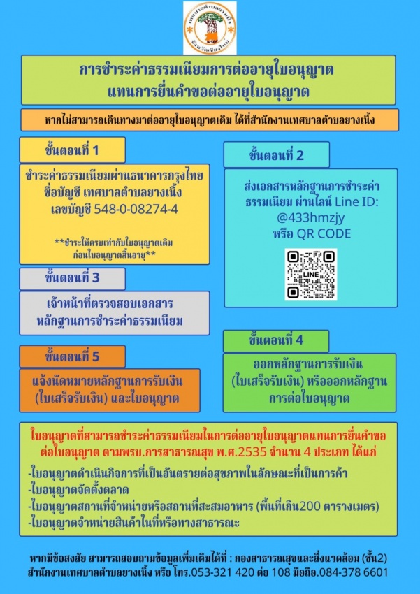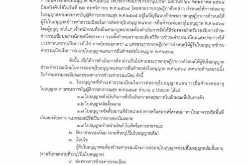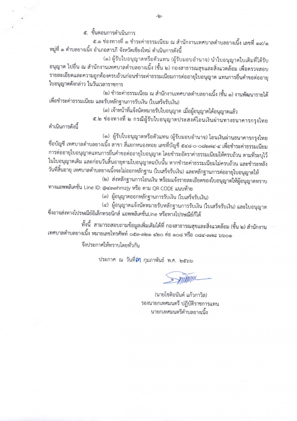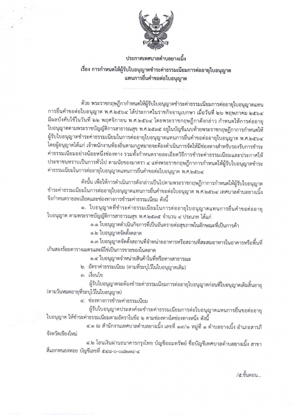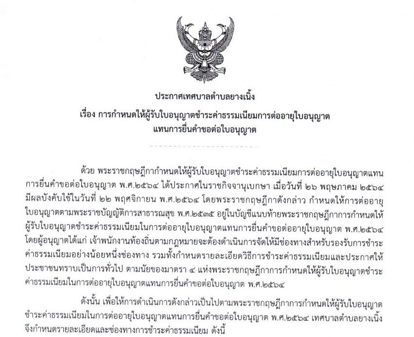 ประกาศเทศบาลตำบลยางเนิ้ง เรื่อง การกำหนดให้ผู้รับใบอนุญาตชำระค่าธรรมเนียมการต่อใบอนุญาตแทนการยื่นคำขอใบอนุญาต