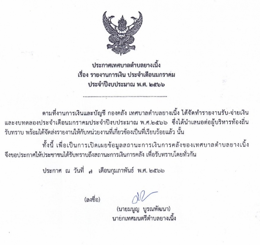 รายงานการเงิน ประจำเดือนมกราคม 2566 เทศบาลตำบลยางเนิ้ง ได้จัดทำรายงานรับ-จ่ายเงิน และงบทดลองประจำเดือน ปีงบประมาณ พ.ศ. 2566 เพื่อเป็นการเปิดเผยข้อมูลสถานการเงินการคลังของเทศบาลตำบลยางเนิ้ง จึงขอประกาศให้ประชาชนได้รับทราบถึงสถานะการคลัง เพื่อรับทราบโดยทั่วกัน