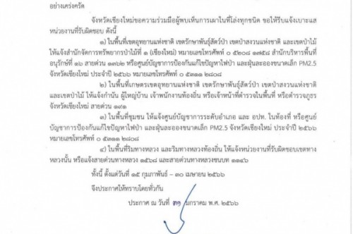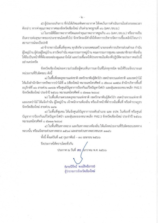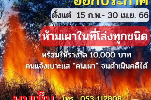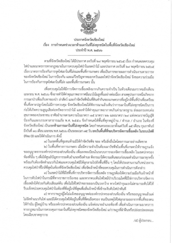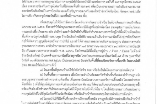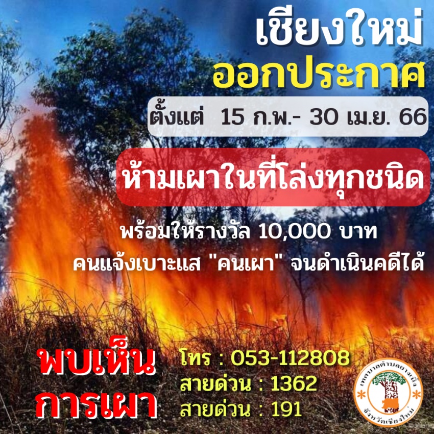 จังหวัดเชียงใหม่ ประกาศ "ห้ามเผาในที่โล่งทุกชนิด" บังคับใช้ ตั้งแต่ 15 ก.พ. - 30 เม.ย. 66