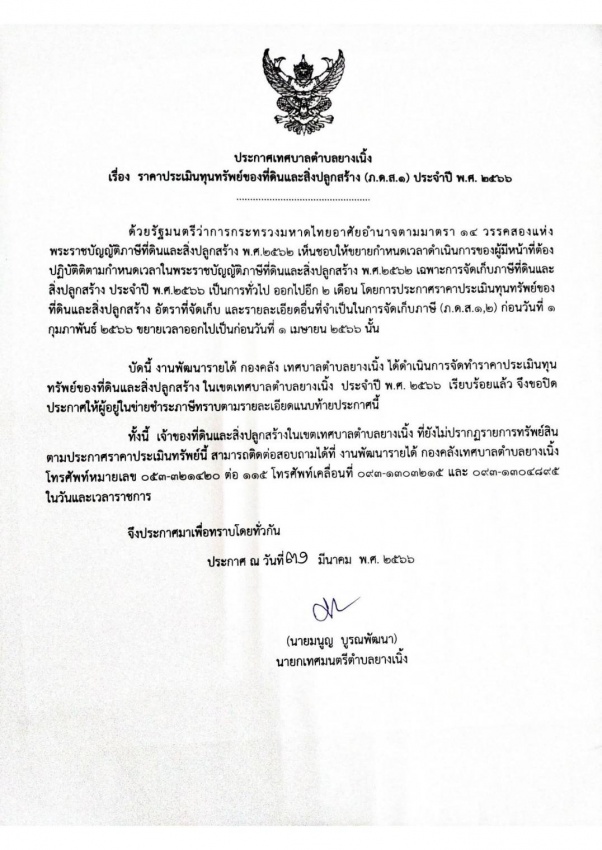 ประกาศเทศบาลตำบลยางเนิ้ง เรื่อง ราคาประเมินทุนทรัพย์ของที่ดินและสิ่งปลูกสร้าง (ภ.ด.ส.1) ปี 2566