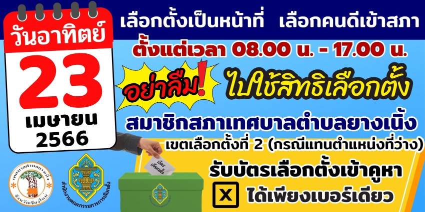 ขอเชิญชวนพี่น้องประชาชน เขตเลือกตั้งที่ 2 ตำบลยางเนิ้ง ใช้สิทธิเลือกตั้งสมาชิกสภาเทศบาลตำบลยางเนิ้ง (กรณีแทนตำแหน่งที่ว่าง)
