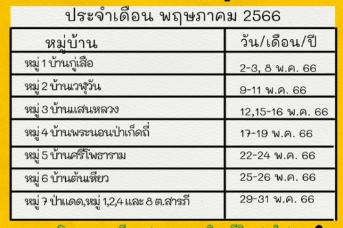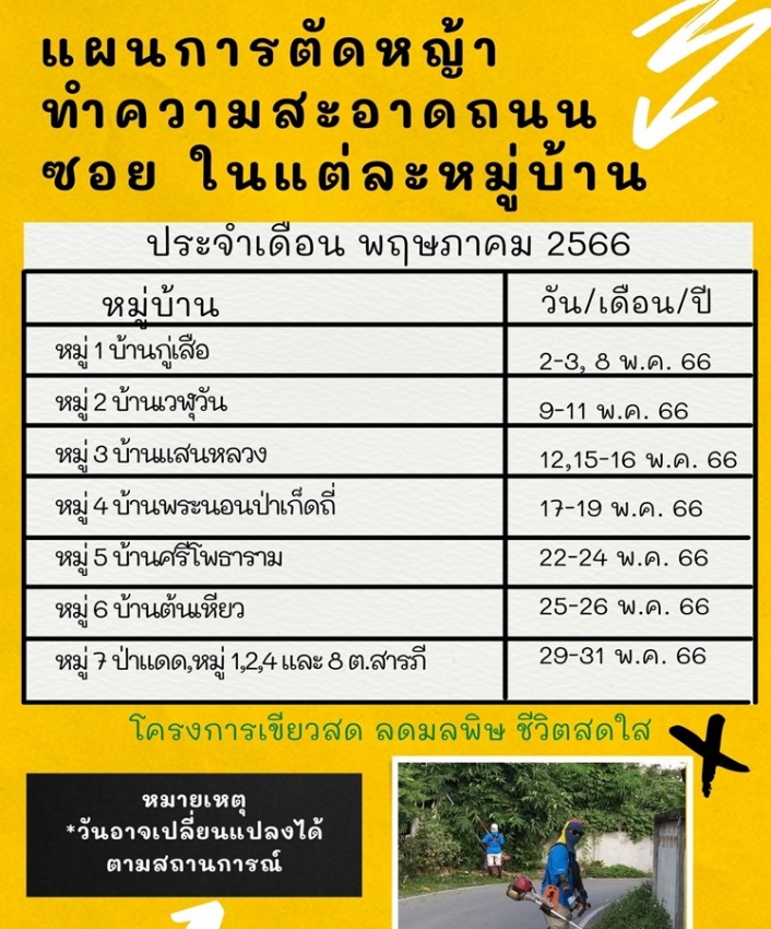 แผนการตัดหญ้า ทำความสะอาด ถนน, ซอย ในแต่ละหมู่บ้าน ประจำเดือน พฤษภาคม 2566