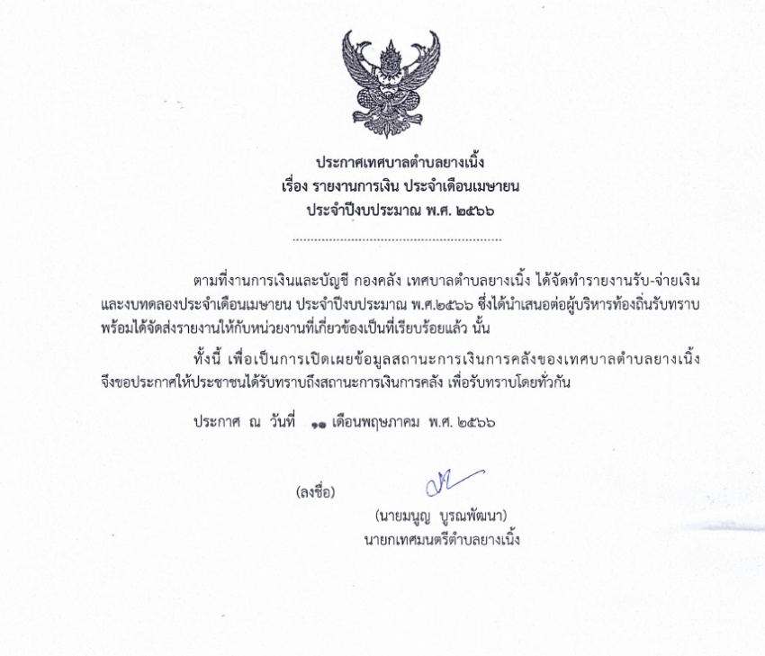 ประกาศเทศบาลตำบลยางเนิ้ง เรื่องรายงานการเงิน ประจำเดือนเมษายน