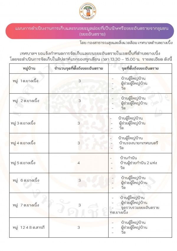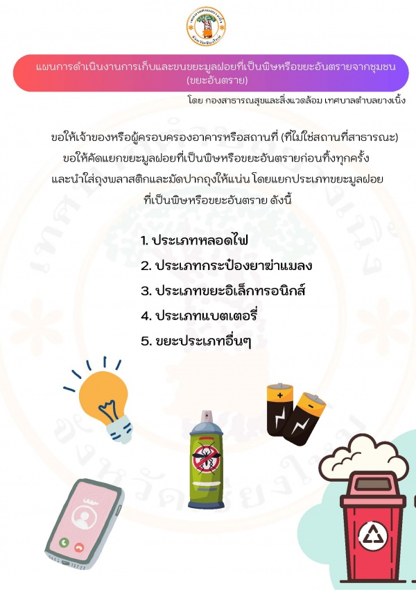| 1 | แผนการดำเนินงานการเก็บและขนขยะมูลฝอยที่เป็นพิษหรือขยะอันตรายจากชุมชน (ขยะอันตราย) | 1.01 MB. | 114 |
