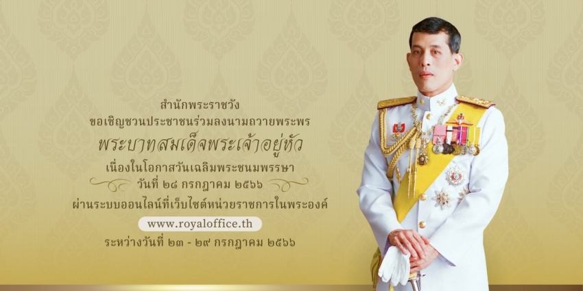 ขอเชิญชวนประชาชนร่วมลงนามถวายพระพร พระบาทสมเด็จพระเจ้าอยู่หัว เนื่องในโอกาสวันเฉลิมพระชนมพรรษา วันที่ ๒๘ กรกฎาคม ๒๕๖๖ ผ่านระบบออนไลน์ ที่เว็บไซต์หน่วยราชการในพระองค์ ระหว่างวันที่ ๒๓ - ๒๙ กรกฎาคม ๒๕๖๖