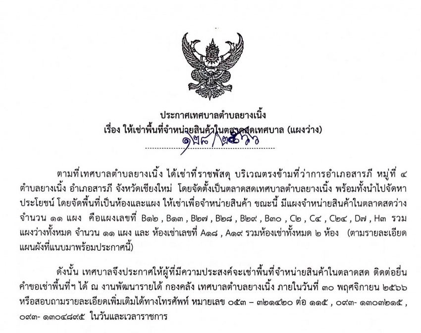ประกาศเทศบาลตำบลยางเนิ้ง เรื่อง ให้เช่าพื้นที่จำหน่ายสินค้าในตลาดสดเทศบาล (แผงว่าง)