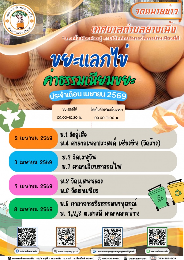 ตารางขยะแลกไข่และจัดเก็บค่าธรรมเนียมขยะประจำเดือนเมษายน 2569