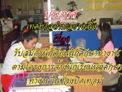 เทศบาลตำบลยางเนิ้ง มีความประสงค์จะรับสมัครนักเรียน/นักศึกษา ทำงานช่วงปิดภาคเรียนฤดูร้อน ระยะเวลาวันรับสมัครระหว่างวันที่15-19 มีนาคม 2553 ณ สำนักงานเทศบาลตำบลยางเนิ้ง และระยะเวลาวันปฏิบัติงานระหว่างวันที่ 1-30 เมษายน 2553 อัตราค่าตอบแทนวันละ 200 บาท