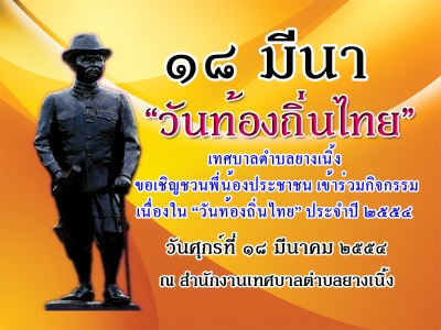 เทศบาลตำบลยางเนิ้ง ขอเชิญชวนพี่น้องประชาชน เข้าร่วมกิจกรรมเนื่องใน วันท้องถิ่นไทย ประจำปี ๒๕๕๔ โดยมีวัตถุประสงค์เพื่อน้อมรำลึกถึงพระมหากรุณาธิคุณแห่งองค์พระบาทสมเด็จ พระจุลจอมเกล้าเจ้าอยู่หัว รัชกาลที่ ๕ ได้ทรงพระกรุณาโปรดเกล้าโปรดกระหม่อมให้จัดตั้งสุขาภิบาลท่าฉลอมขึ้นเป็นแห่งแรก ในวันที่ ๑๘ มีนาคม ๒๕๔๘ นับเป็นจุดเริ่มต้นของการกระจายอำนาจการปกครอง และเป็นการถือกำเนิดของการปกครองส่วนท้องถิ่นครั้งแรกในประเทศไทย ดังนั้นทางคณะรัฐมนตรีในรัฐบาลชุดปัจจุบันได้เห็นความสำคัญดังกล่าวได้มีมติกำหนดให้วันที่ ๑๘ มีนาคม ของทุกปีเป็นวันท้องถิ่นไทย และเพื่อให้สาธารณชนได้เห็นความสำคัญของการปกครองส่วนท้องถิ่น โดยภายในงานวันท้องถิ่นไทย จะได้สัมผัสกับกิจกรรมมากมายโดยแบ่งเป็น ๒ ส่วน ดังนี้ ส่วนที่ ๑ กิจกรรมหน้าลานสำนักงานเทศบาลตำบลยางเนิ้ง - พิธีถวายราชสักการะพระบาทสมเด็จพระจุลจอมเกล้าเจ้าอยู่หัว รัชกาลที่ ๕ - จัดนิทรรศการให้ความรู้การป้องกันภัยเบื้องต้น กิจกรรมรณรงค์สวมหมวกนิรภัยเพื่อการขับขี่ที่ ปลอดภัยพร้อมจำหน่ายหมวกนิรภัย - ปรึกษาปัญหากฎหมาย - จำหน่ายผักปลอดสารพิษ - ตรวจวัดสายตา โดยร้านพรพิงค์การแว่น - นิทรรศการให้ความรู้ การจดทะเบียนพาณิชย์ ให้บริการจัดเก็บภาษีทุกประเภท - การแสดงของเด็กนักเรียนศูนย์พัฒนาเด็กเล็กเทศบาลตำบลยางเนิ้ง - ให้บริการตรวจสุขภาพ - ให้บริการฉีดยาป้องกันโรคพิษสุนัขบ้า - นิทรรศการความรู้และคำแนะนำต่างๆ เกี่ยวกับงานก่อสร้างควบคุมอาคาร - ให้บริการยื่นแบบก่อสร้าง และแจกเอกสารประชาสัมพันธ์งานก่อสร้าง ควบคุมอาคาร ส่วนที่ ๒ ภายในงานยังมีการจัดประชุมเวทีประชาคมเมือง เพื่อส่งเสริมกระบวนการร่วมคิด ร่วมสร้าง สังคมคุณภาพ ร่วมเสวนาสรุปปัญหา ความต้องการ นำเสนอประเด็นการพัฒนาและโครงการที่จะบรรจุไว้ในแผนพัฒนาเทศบาลสามปี (พ.ศ. ๒๕๕๕-๒๕๕๗) ณ ห้องประชุมเทศบาลตำบลยางเนิ้ง ชั้น ๒ สำหรับงานวันท้องถิ่นไทย จะมีขึ้นในวันศุกร์ ที่ ๑๘ มีนาคม ๒๕๕๔ เวลาตั้งแต่ ๐๘.๓๐ เป็นต้นไป ณ สำนักงานเทศบาลตำบลยางเนิ้ง ตำบลยางเนิ้ง อำเภอสารภี จังหวัดเชียงใหม่ สนใจดูรายละเอียดเพิ่มเติมได้ที่ เทศบาลตำบลยางเนิ้ง ๐-๕๓๓๒-๑๔๒๐
