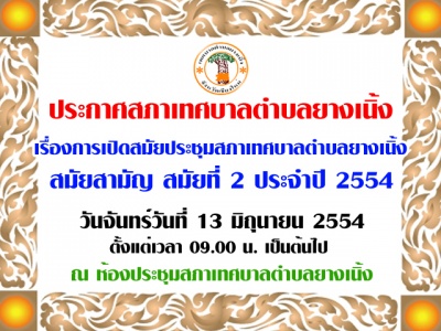 เรื่องการเปิดสมัยประชุมสภาเทศบาลตำบลยางเนิ้ง สมัยสามัญ สมัยที่ ๒ ประจำปี ๒๕๕๔ ด้วยสภาเทศบาลตำบลยางเนิ้ง ได้มีมติในคราวประชุมสภาเทศบาลตำบลยางเนิ้ง สมัยสามัญ สมัยแรก ประจำปี ๒๕๕๔ เมื่อวันที่ ๗ มีนาคม ๒๕๕๔ กำหนดสมัยประชุมสามัญ สมัยที่ ๒ ประจำปี ๒๕๕๔ มีกำหนด ๓๐ วัน เริ่มตั้งแต่วันที่ ๑๖ พฤษภาคม ถึง ๑๔ มิถุนายน ๒๕๕๔ อาศัยอำนาจตามความในมาตรา ๒๕ แห่งพระราชบัญญัติเทศบาล พ.ศ. ๒๔๙๖ และที่แก้ไขเพิ่มเติมจนถึง (ฉบับที่ ๑๓) พ.ศ. ๒๕๕๒ จึงกำหนดการประชุมสภาเทศบาลฯ สมัยสามัญ สมัยที่ ๒ ประจำปี ๒๕๕๔ ในวันที่ ๑๓ มิถุนายน ๒๕๕๔ ณ ห้องประชุมสภาเทศบาลตำบลยางเนิ้ง