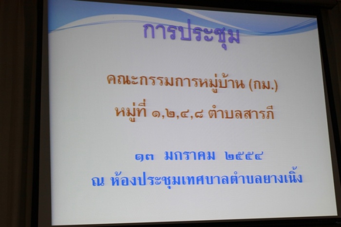 คณะผู้บริหาร สมาชิกสภาฯ หัวหน้าส่วนราชการ คณะกรรมการหมู่บ้าน ร่วมประชุมปรึกษาหารือ เพื่อรับทราบปัญหาความต้องการแลกเปลี่ยนความคิดเห็นระดมความคิดในการพัฒนาหมู่บ้าน แลกเปลี่ยนความรู้ประสบการณ์ ข้อมูลข่าวสาร ข้อจำกัดความต้องการ และศักยภาพของผู้ที่เกี่ยวข้องต่างๆ ในการหาแนวทางแก้ไขปัญหาให้ตรงกับสภาพปัญหาความต้องการที่แท้จริงของหมู่ ๑,๒,๔,๘ ต.สารภี อีกทั้งยังจะเป็นการเพิ่มศักยภาพในการแก้ปัญหาได้อย่างรวดเร็ว เป็นระบบ และมีประสิทธิภาพ เมื่อวันที่ ๑๓ มกราคม ๒๕๕๕ ที่ผ่านมา โดยมี ท่านดำรงค์ ทิพย์เดช ปลัดอาวุโส อำเภอสารภี ให้เกียรติมาเป็นประธาน ณ ห้องประชุมเทศบาลตำบลยางเนิ้ง ชั้น ๒.....